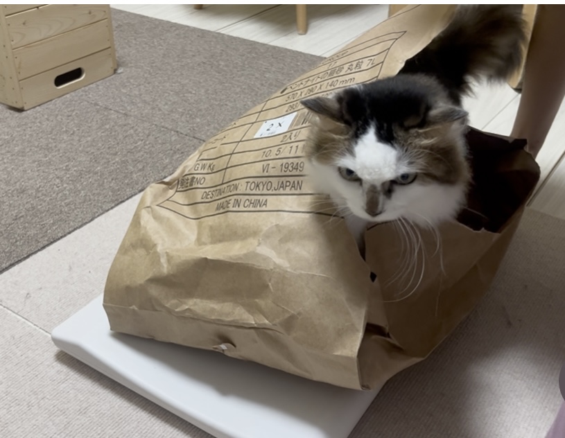 (この紙袋、紙の厚さや袋の大きさがちょうどよくてとても気に入っています。カインズやビバホームなどでセット売りしている猫砂の外袋なのですが、外からカサカサ音を出すととっても楽しそうに遊んでくれます♪)